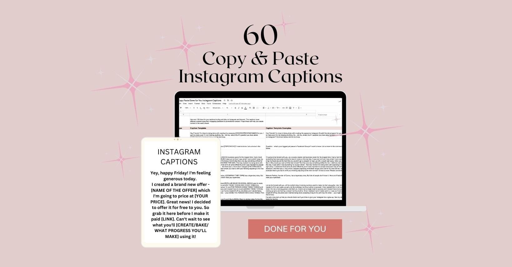 ONE TIME OFFER $17: Save over $80 (regular price $97) ✅ get clear and intentional with your content while boosting your engagement. Do you feel stuck on what to post & when or so overwhelmed that you don’t post at all? ✅ these 60 plug & play engaging Instagram™ post captions can be adjusted to any niche. ✅ every caption includes the exact example of how to use it so that it perfectly fits your style ✅ you’ll be able to simply copy and paste the captions quickly filling in the blanks so that they’re beautifully customized and speak right to your audience ✅ get the 60 done for you Instagram™ post captions to create content quickly and with ease while boosting your engagement.